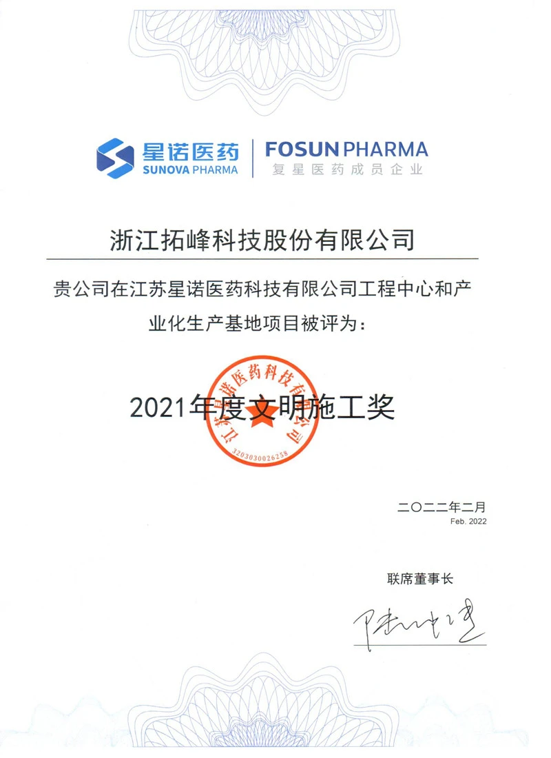 近日,江苏星诺医药科技有限公司对所有乙方开展了2020年工作考评,中拓合控凭借自身过硬的技术能力和良好的施工素质,获得了星诺医药颁发的“2021年度文明施工奖”。