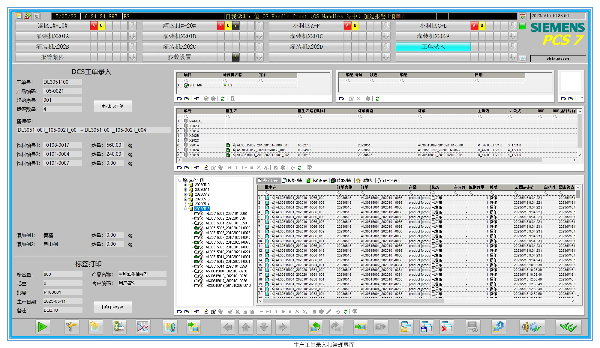 由于每日订单繁多,而且还有频繁的插单和改单事件,为保证生产计划的顺利完成,在该项目中设计了基于SIMATIC PCS 7监控界面中进行临时(插单)生产工单录入和工单标签打印功能,。图中左侧为订单录入操作界面,进行类似ERP的订单和BOM的编辑生成。图中右侧为订单工单的归集总览,展现了各个不同Units(灌装机)的生产批次状态。
