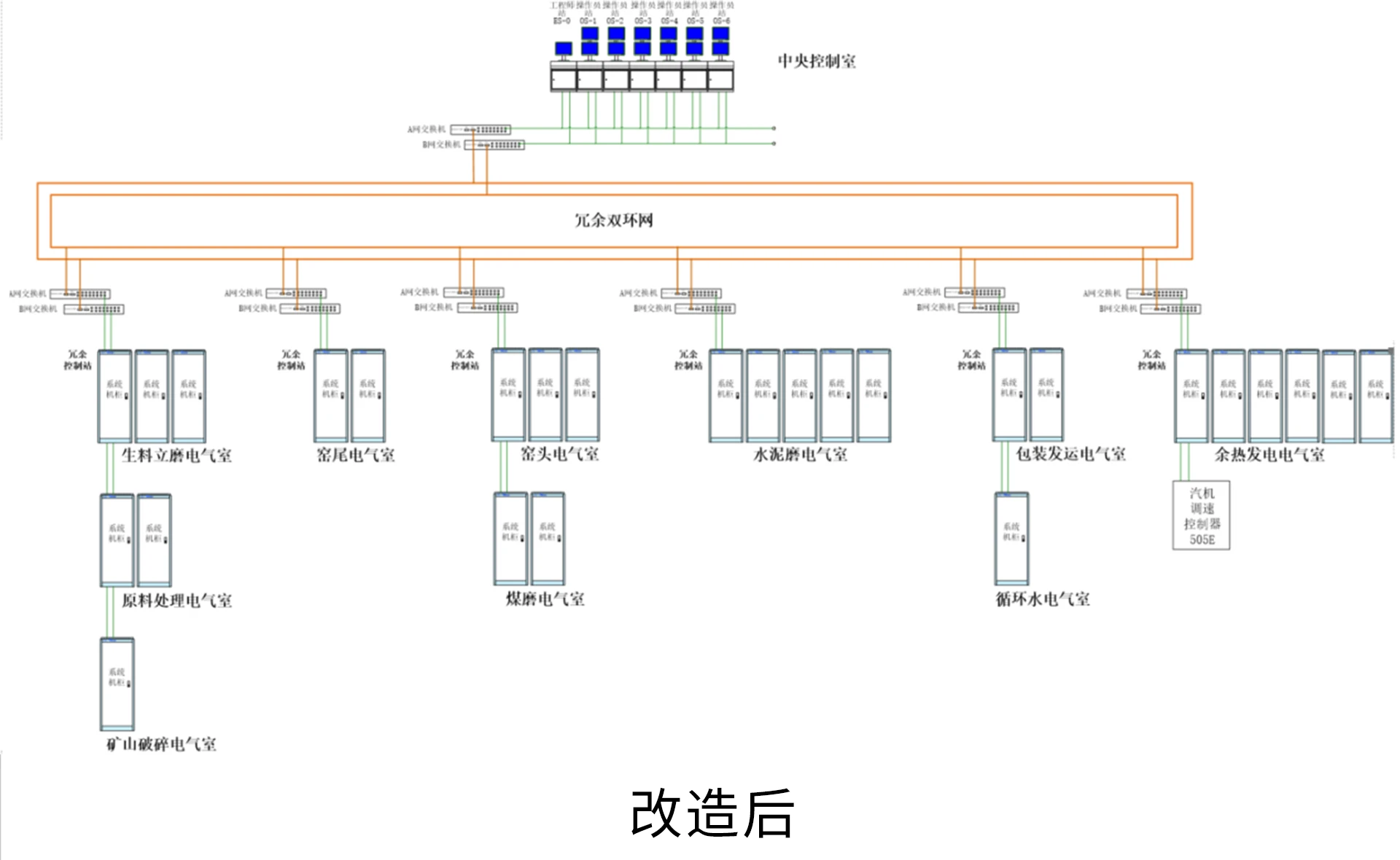 某水泥建材公司拥有一条2000t/d新型干法水泥生产线,并配套4.5MW余热发电装置,正在使用的控制系统品类繁多,包括中控的ECS-100 DCS控制系统,正泰中自的TDCS9200 DCS控制系统,施耐德TSX PSY2600 PLC控制系统等。生产装置投产已超过13年,存在标识不清、线号脱落、电缆长度受限、部分光缆断裂失效、资料残缺、系统带病运行等诸多问题。因使用年限长,备件停产,厂家售后技术服务跟不上等多方面原因,给控制系统维护工作带来诸多困难,甚至影响装置的正常生产。业主希望改造方案能兼顾长期可靠的备件服务、系统先进性和升级部署的灵活性。经招投标,中拓合控基于SIEMENS 1500R/H系统的升级改造方案得到了最终认可。