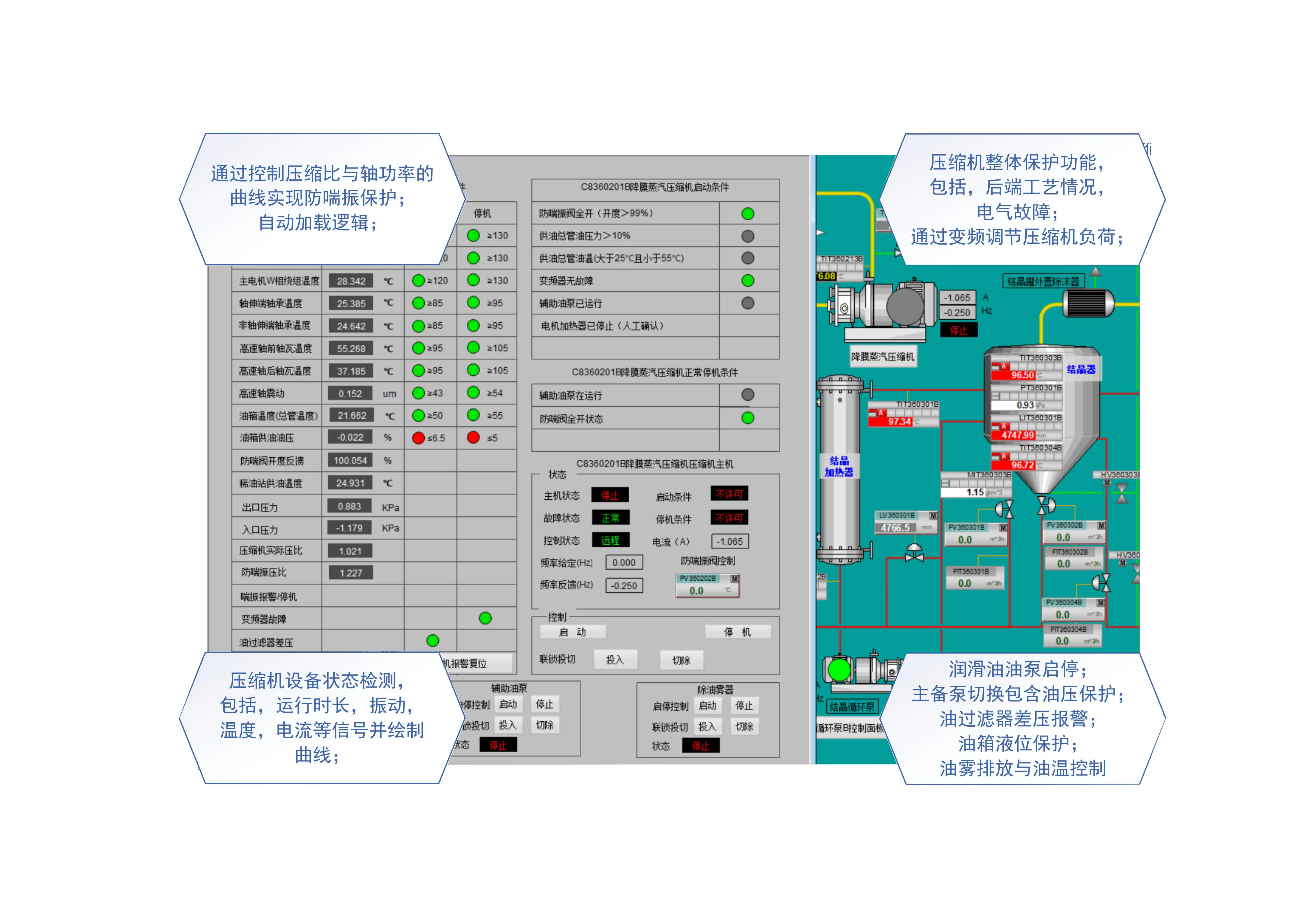 本项目的最终产物为磷酸铁固体,最终的母液通过蒸发结晶工艺生成结晶。其中的蒸汽压缩机起到回收二次蒸汽,提高热能使用率,为结晶工段的核心设备。在实际现场调试过程中,工程师团队根据现场实际情况,结合公司之前空分项目压缩机控制的控制模板,开发出一个专门针对蒸汽压缩机的控制模板,以避免压缩机因喘振超限停机,确保MVR结晶流程连续稳定。具体功能如下: