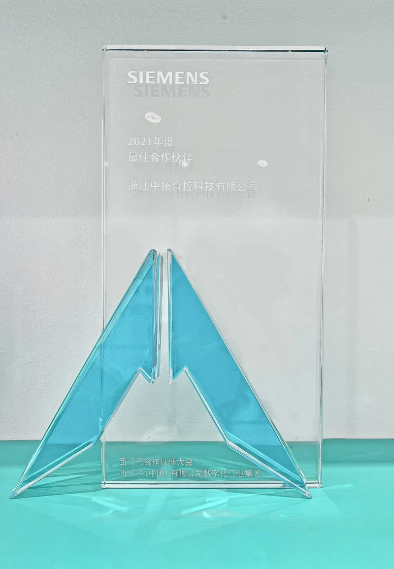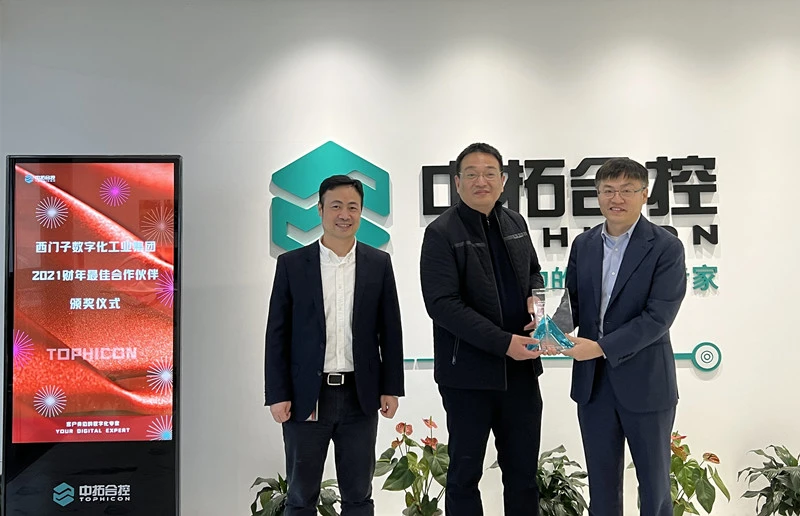 基于疫情的形势,为保障合作伙伴的安全,西门子数字化工业集团原计划年底召开的系统集成商大会今年转换形式开展——单点线下颁奖。 2022年3月1日,西门子(中国)有限公司西门子数字化工业集团副总裁兼华东大区总经理张劲松先生、华东大区浙江区域总经理吴潜先生莅临浙江中拓合控科技有限公司,进行现场颁奖仪式。浙江中拓合控科技有限公司总经理陈海东先生出席并接收沉甸甸的奖杯——最佳合作伙伴。