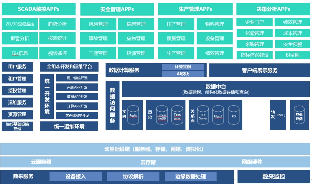 此方案包括四大子系统:水源井智能监控系统、处理厂监控管理系统、泵站无人值守监控系统、区域中心管理系统。通过现场的数采仪、水质水压表等在线感知设备,将其运行状态汇集到云上,将海量的水务设备信息进行及时分析与处理,以更加精细和动态的方式管理水务系统的整个生产、管理和服务流程。从而提高生产效率,降低运维成本,达到高效、高能和智慧的状态。