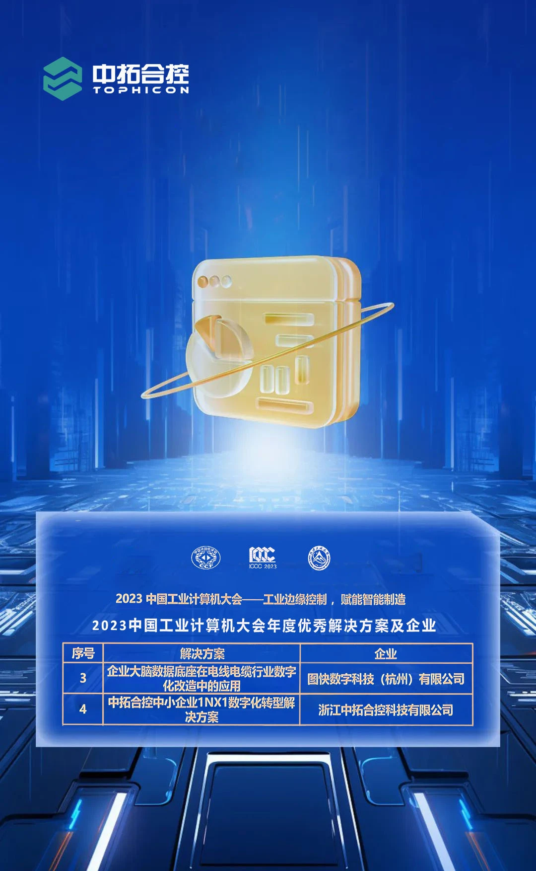“中拓合控中小企业1NX1数字化转型解决方案”被评为2023年度中国工业计算机领域优秀解决方案。