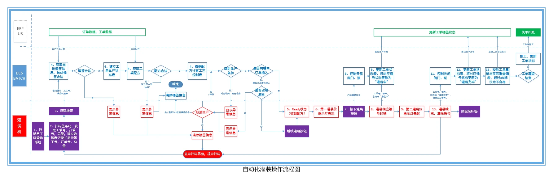 灌装生产操作主要流程为:生产调度人员在ERP上读取销售订单和安排生产计划,将生产计划推送到SIMATIC BATCH系统,经过系统运算后,打印输出相应的二维码信息标签;数字化灌装机扫码获取工单信息,将工单确认标志发送给SIMATIC PCS 7系统;PCS 7进行原料的规划查错后,下发配方BOM给数字化灌装机,PLC得到配方和工艺路径,系统根据工艺顺序完成自动配料、搅拌和; 工单完成后,灌装机回信PCS 7系统完成标志,此时系统将实际灌装的配料数量、操作人员等报工信息归档到BATCH系统,并上送给ERP,完成从订单-工单-生产-报工-出入库(含扣减原料)生产流程中人机料法环的全数字化闭环管理。