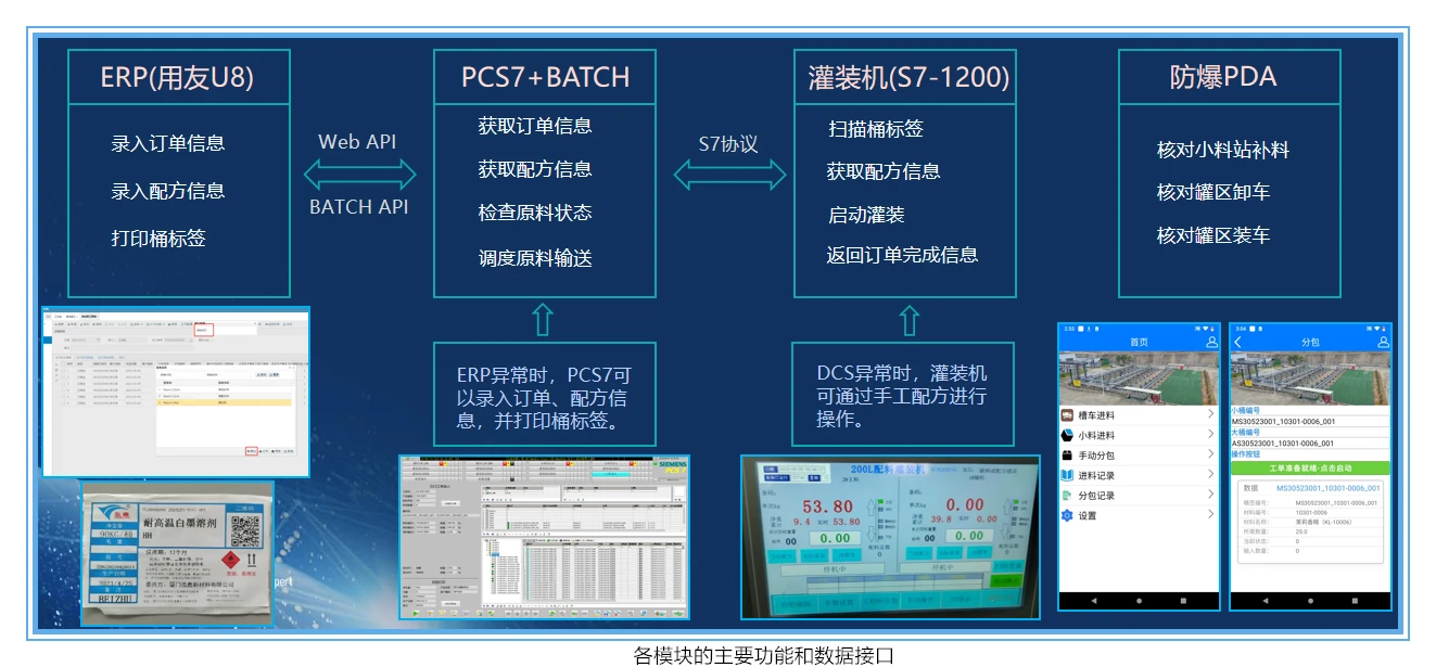 本项目涉及到多处不同类型数据终端的通信,包括用友U8、SIMATIC PCS 7系统、灌装机S7-1200、SIMATIC BATCH批次控制软件、手持防爆终端PDA等。不同类型的终端之间通过系统提供的接口或自定义开发的API函数进行数据交互,完成整个“ERP - BATCH - DCS - PLC”的数据集成。SIEMENS全集成环境的软硬件,是项目各子系统通讯可靠稳定运行的基础。