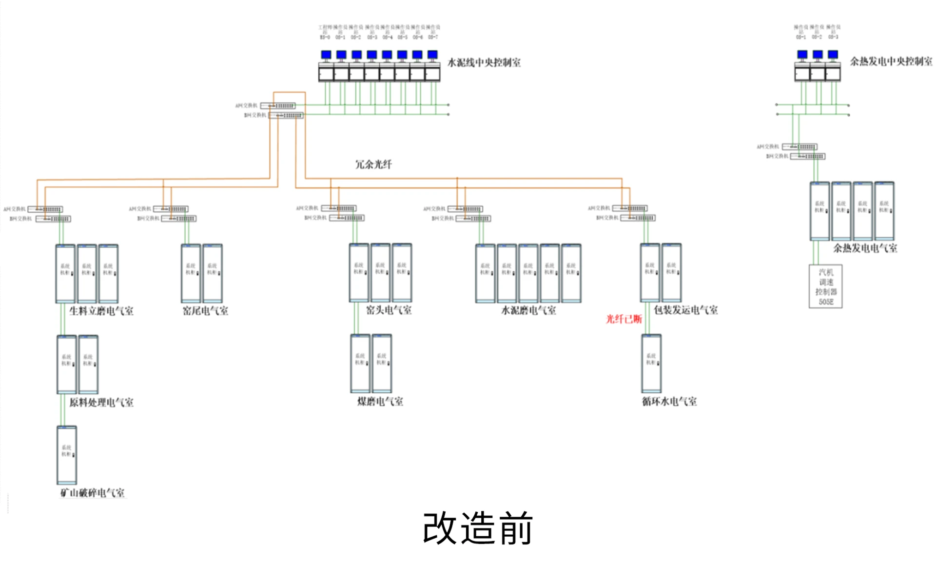 首先对每一个电气机柜间都进行详细的测绘和预设计。其次对全厂光缆连接情况进行实地测量,并绘制了《控制系统网络结构图》。对于现有网络存在的问题(如拓扑结构不合理、光缆标识错误、光芯失效)都有详细的记录。然后对现有网络结构进行优化改造,在最大限度利旧现有光缆的基础上,实现冗余环网网络的可靠、稳定、高效的工业拓扑结构,保证生产运行的长久稳定,并为将来数字化工厂的建设,在最核心的网络结构方面,打下坚实的基础。